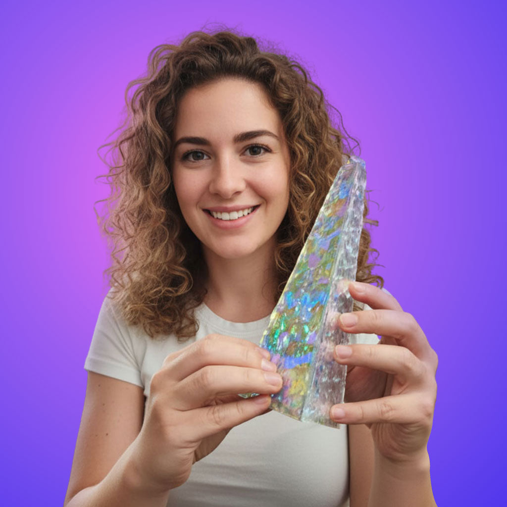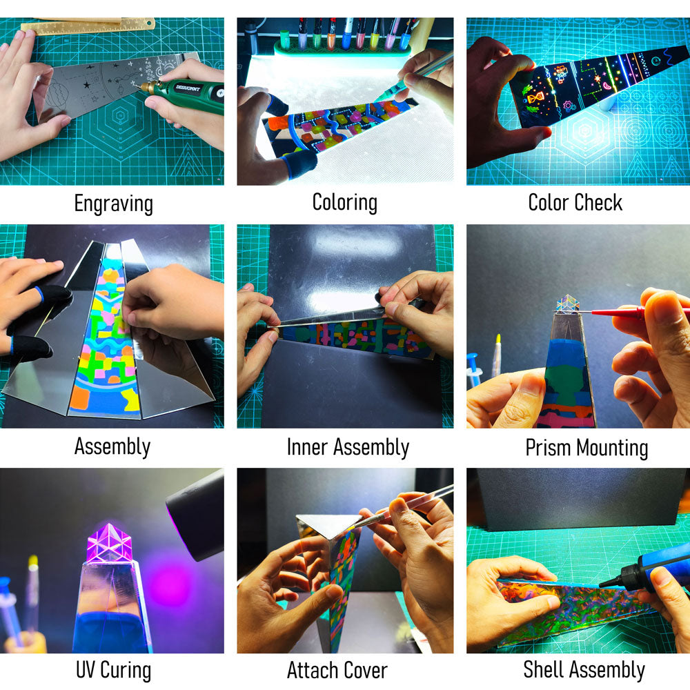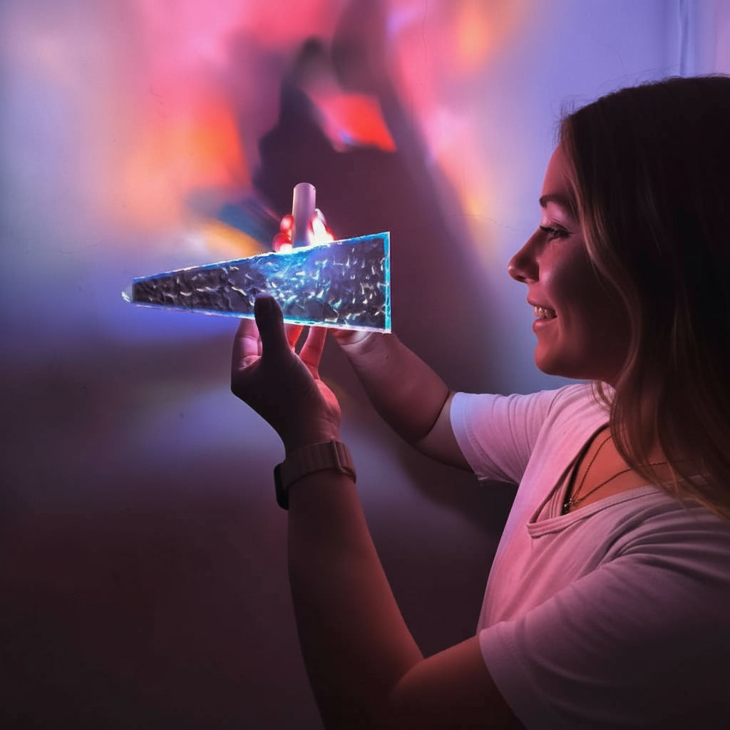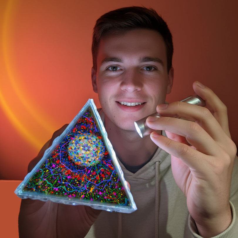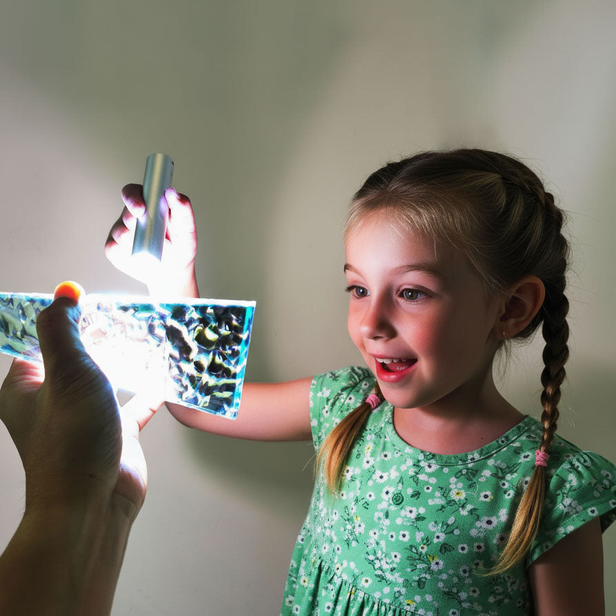 Unlock a breathtaking world of vibrant colors and dynamic patterns! In a dark environment, simply shine your light (flashlight or phone) on the prism or the patterned side, and move it around to witness stunning shifts in color and design. Prepare to be mesmerized!